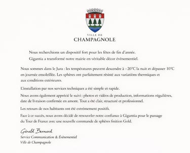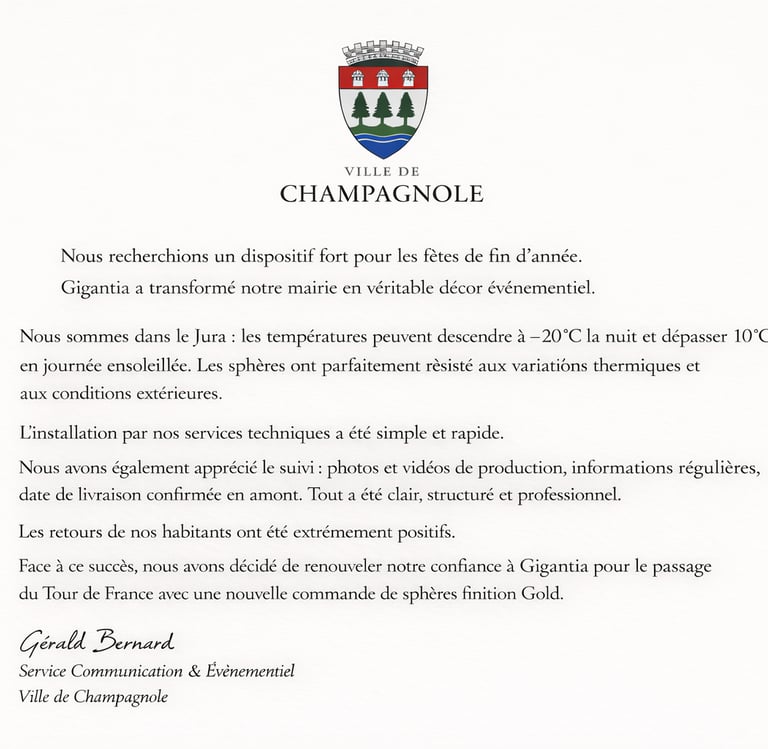 Gigantia conçoit et installe des sphères décoratives monumentales pour villes, mairies et événements publics.