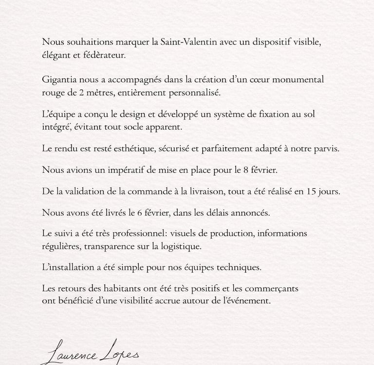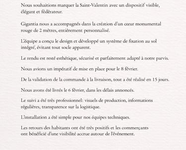 A l'occasion d'Octobre Rose 2025, nous avons accompagné plusieurs collectivités avec des dispositifs visuels forts, notamment des parapluies rose installés au coeur des villes. L'engouement des habitants et l'implication des équipes municipales ont révélé une évidence : l'espace public peut devenir un véritable outil d'attractivité. C'est de cette conviction qu'est née GIGANTIA en novembre 2025.