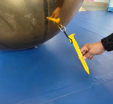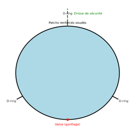 Le poids d'une sphère de 80cm est de 780grammes. Pour répartir le poids, 3 patchs sont répartis à 120° et une drisse de sécurité sont soudés sur le haut de la sphère.